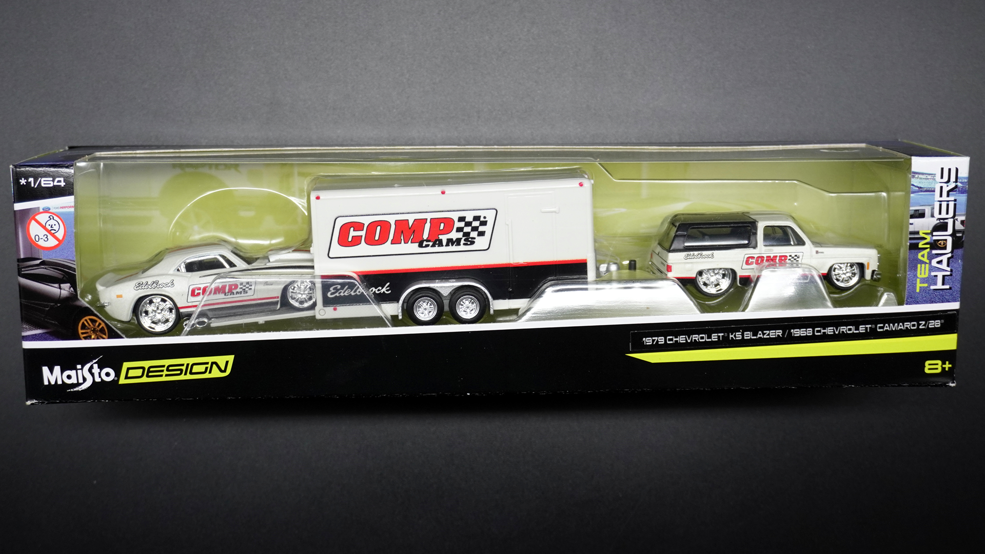1979 Chevrolet K5 Blazer, Trailer e 1968 Chevrolet Camaro Z/28 - 11404 | 1:64 | Design Team Haulers | Maisto